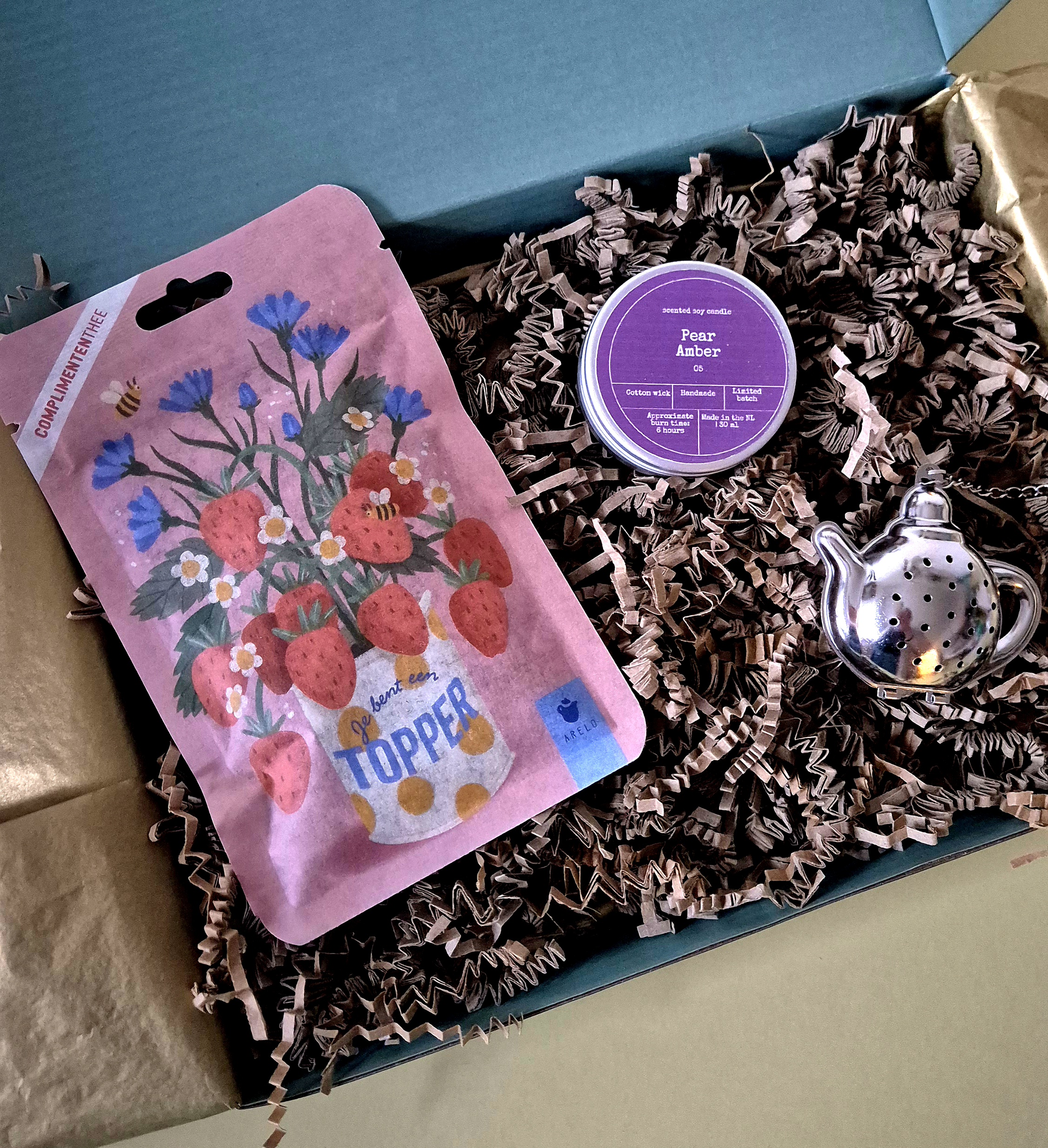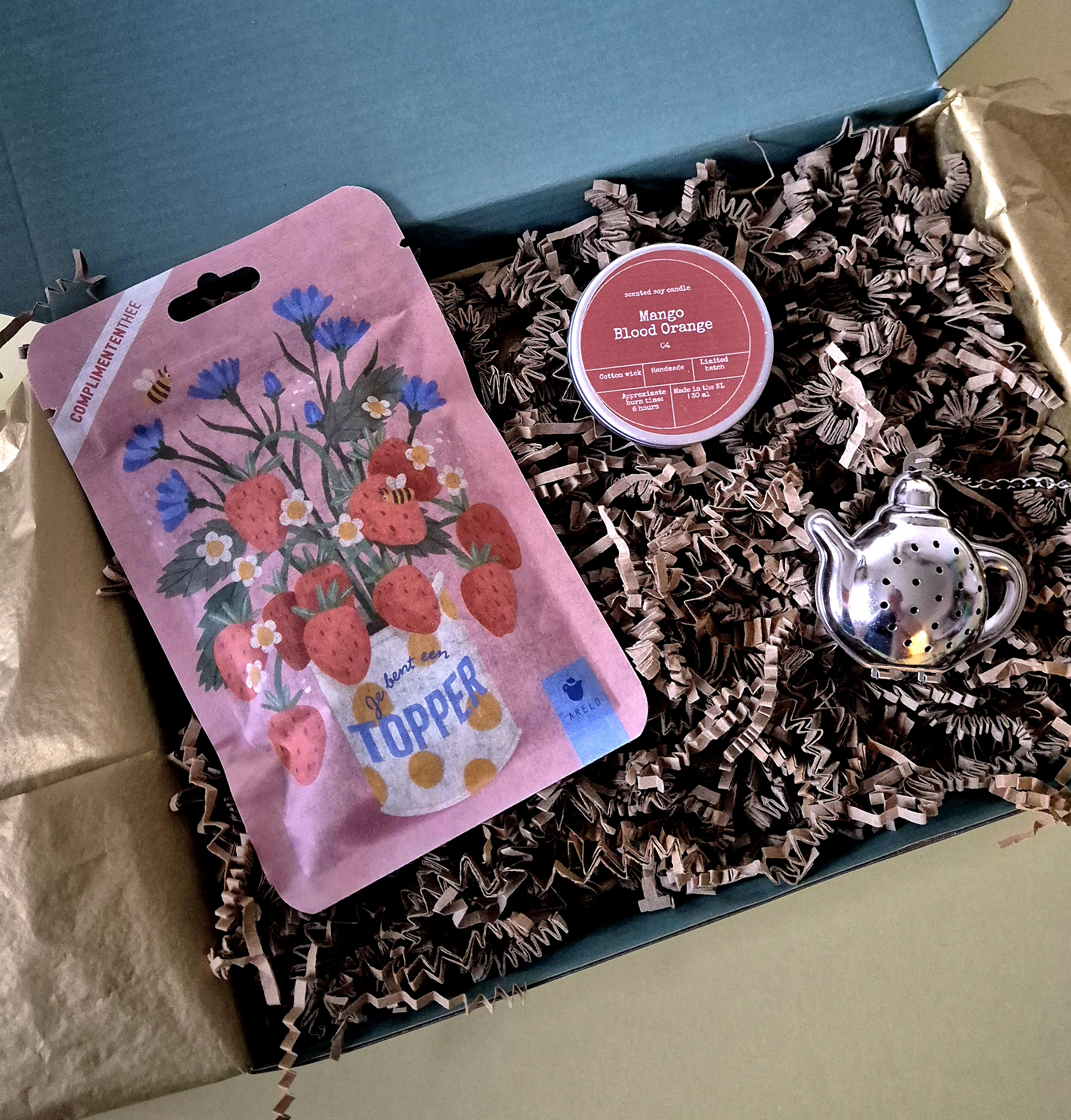 Dit cadeautje bestaat uit heerlijke thee van hoge kwaliteit van Arelo met de tekst ; Je bent een topper met de subtiele smaak van aardbei en abrikoos een kaarsje van Bon Babef in 3 heerlijke verschillende geuren Mango & Bloedsinaasappel, Bergamot & Zeezout of Peer & Amber waar je uit kan kiezen, met een mooi thee-ei in de vorm van een theepot van RVS.