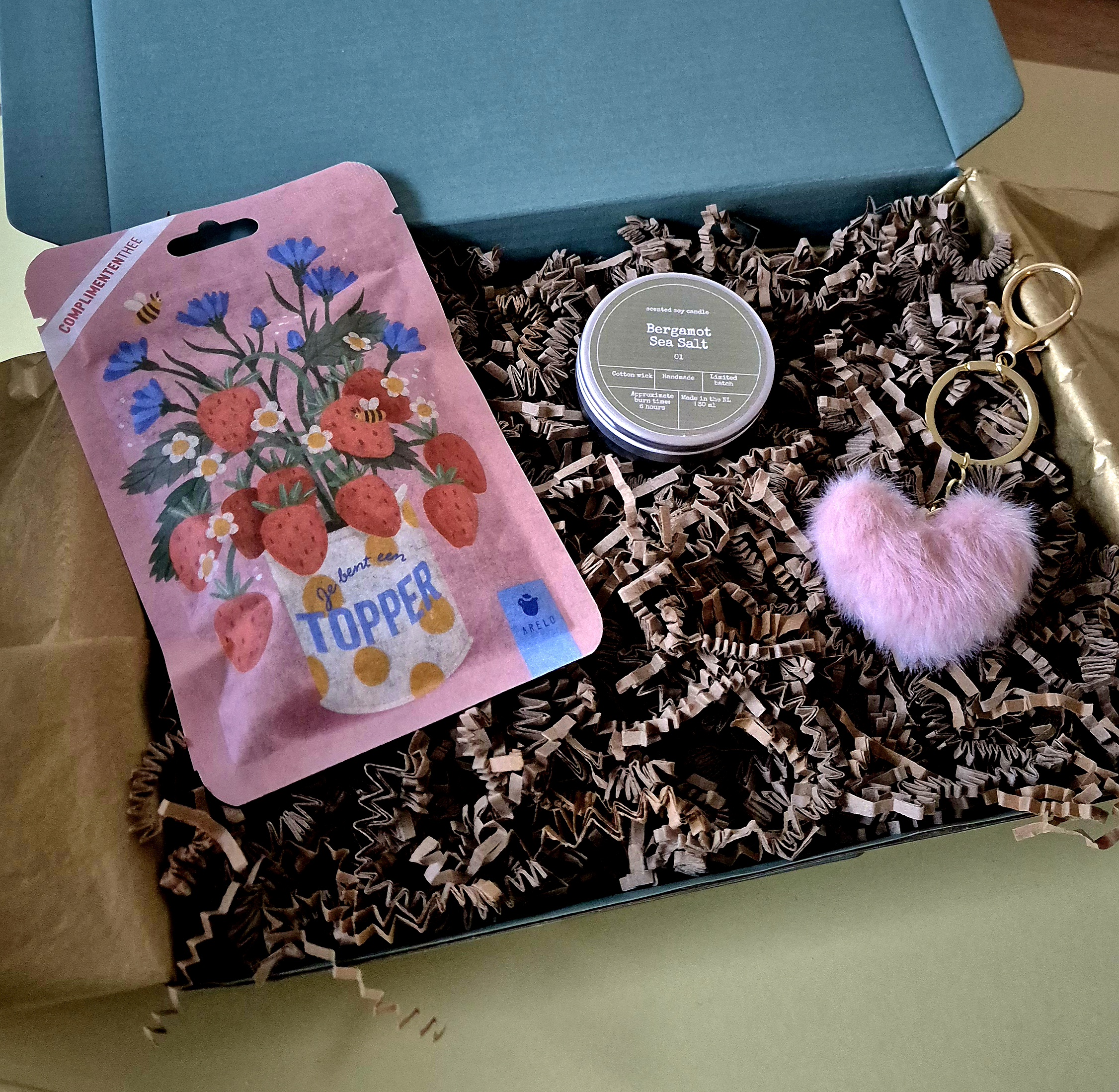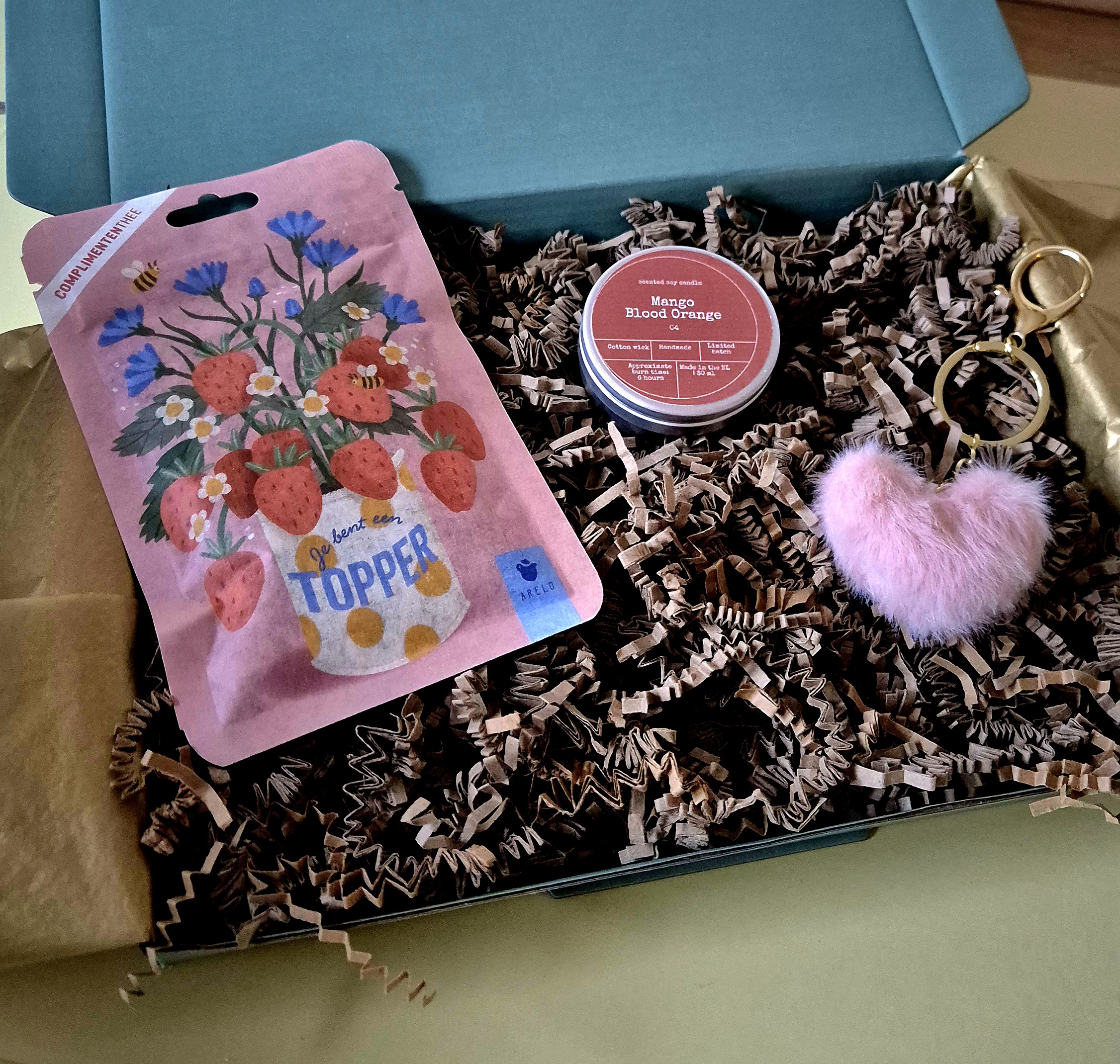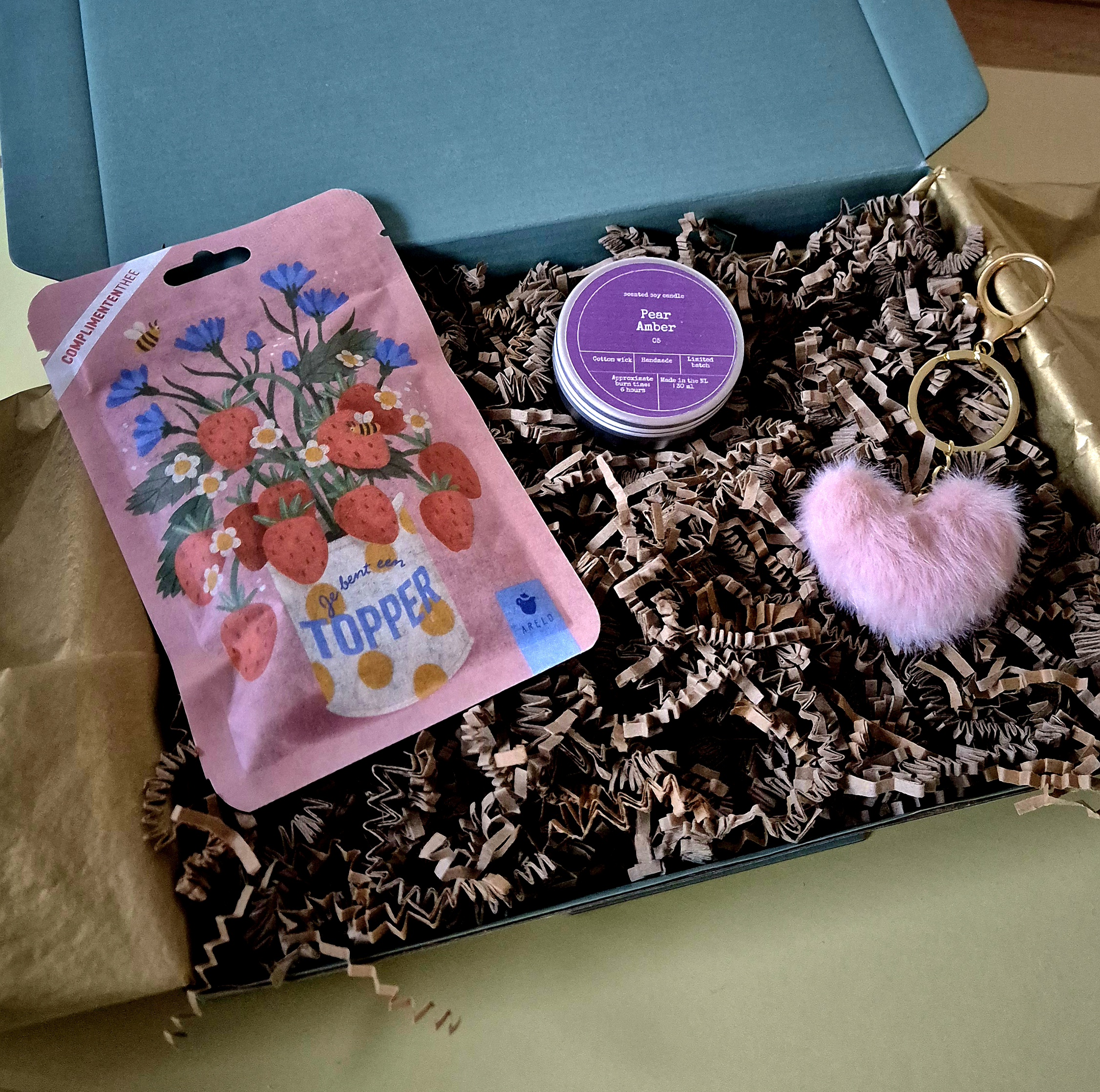 Dit cadeautje bestaat uit heerlijke thee van hoge kwaliteit van Arelo met de tekst ; Je bent een topper met de subtiele smaak van aardbei en abrikoos een kaarsje van Bon Babef in 3 heerlijke verschillende geuren Mango & Bloedsinaasappel, Bergamot & Zeezout of Peer & Amber waar je uit kan kiezen met een leuke sleutelhanger in een roze fluffy hartvorm met goudkleurige accenten van Stationery & Gift.