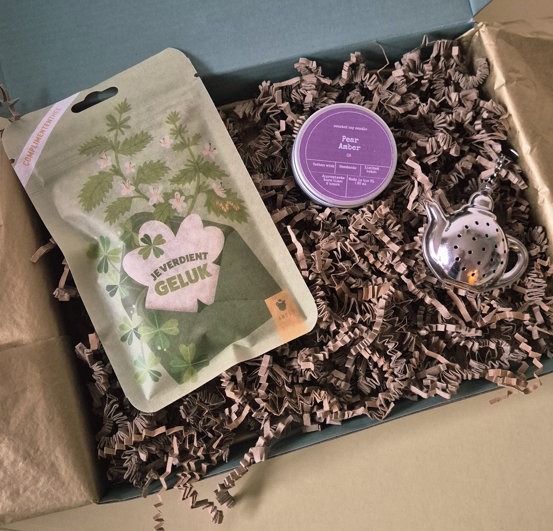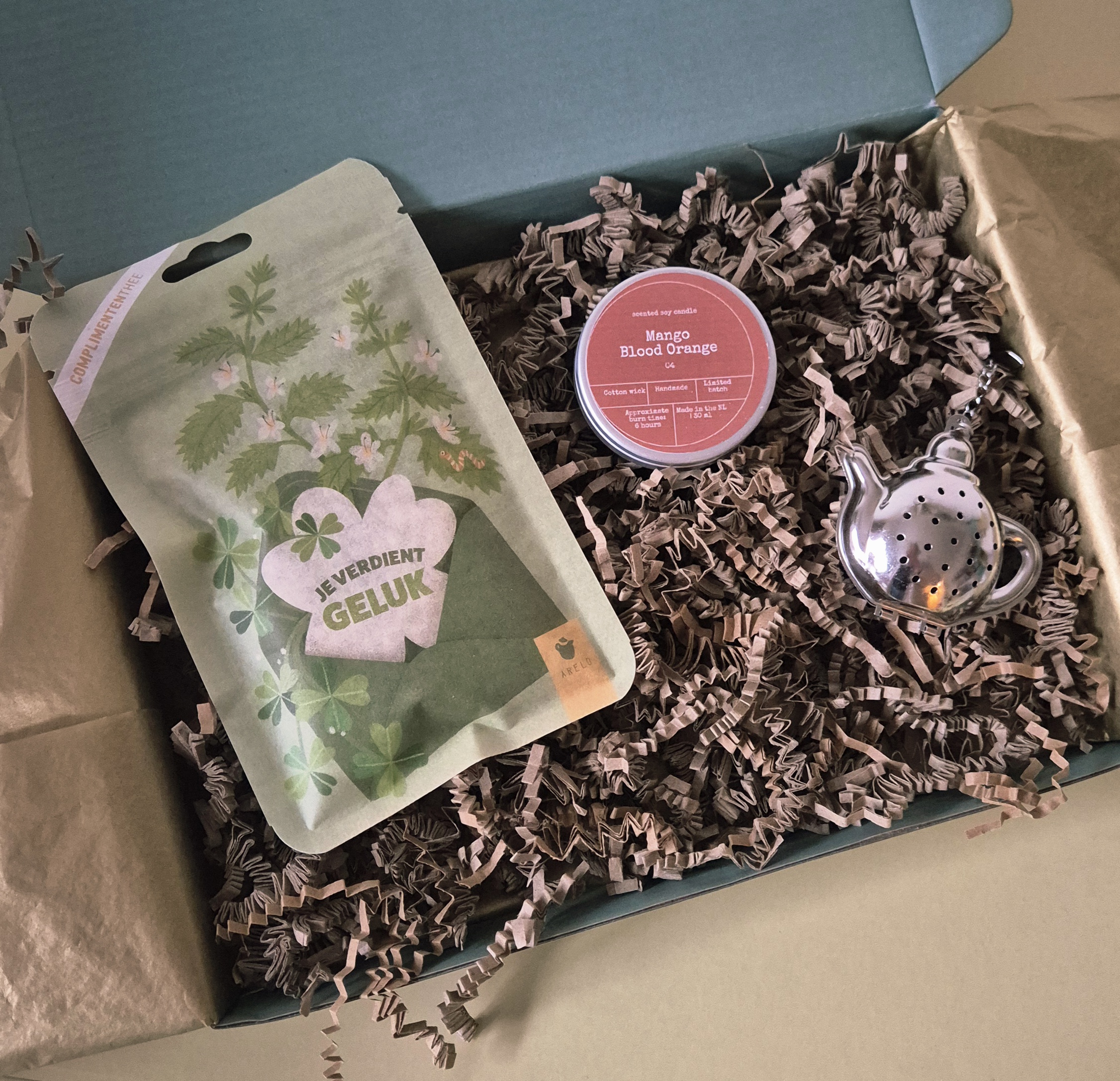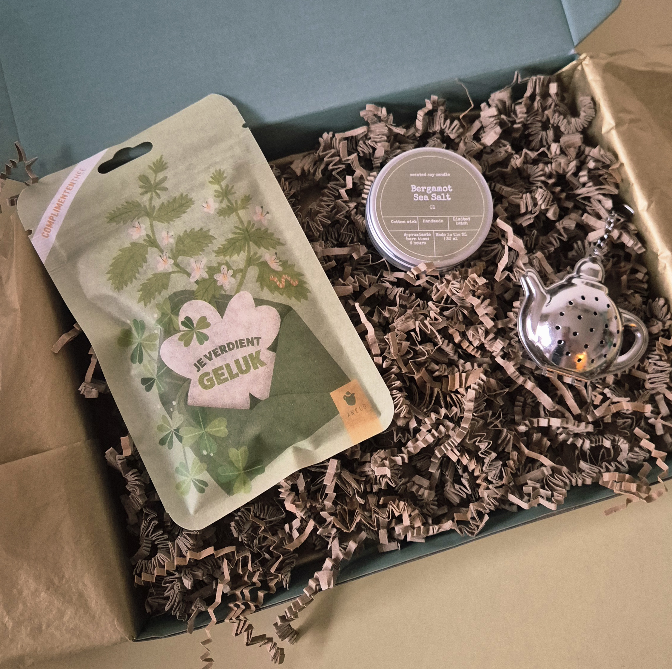 Dit cadeautje bestaat uit heerlijke thee van hoge kwaliteit van Arelo met de tekst ; Je verdient geluk met een kruidige smaak van venkel, appel, citroengras en gember, een kaarsje van Bon Babef in 3 heerlijke verschillende geuren  Mango & Bloedsinaasappel, Bergamot & Zeezout of Peer & Amber waar je uit kan kiezen, met een mooi thee-ei in de vorm van een theepot van RVS.