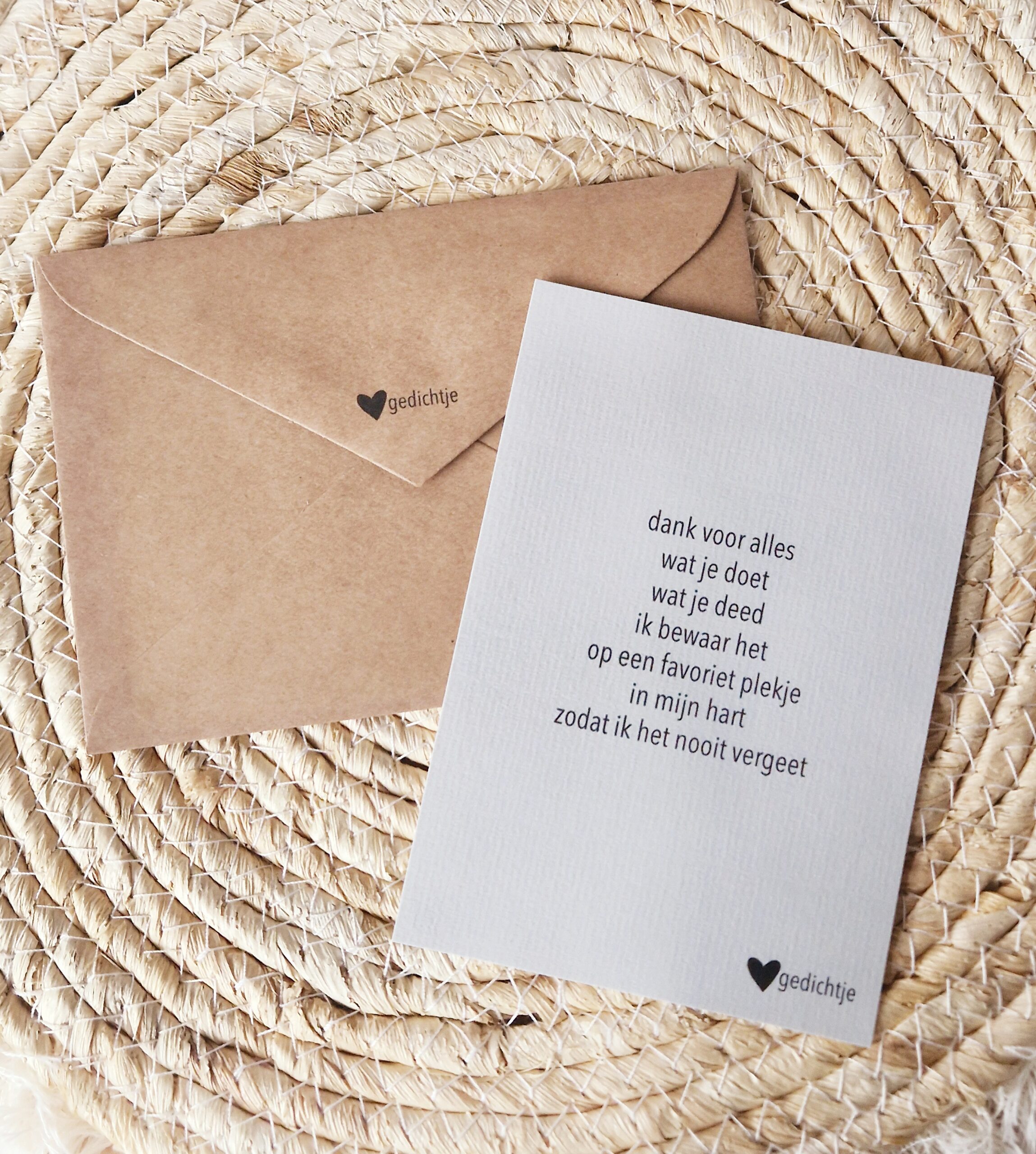 Alle postkaarten hebben een eigen betekenis, een eigen kleur en zijn te gebruiken voor verschillende thema’s. De achterkant is voorzien van voldoende ruimte voor jouw persoonlijke boodschap. Inclusief een kraft envelop met Hartgedichtje logo.